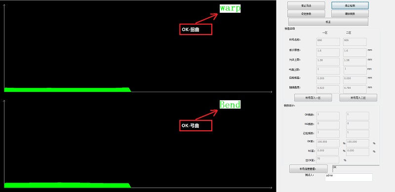 通過位置的信息可以得到PCB板的板厚曲線圖,通過特定軟件算法和翹曲度定義,計算出板翹曲度,并根據(jù)設(shè)定判斷條件得出OK和NG板。
