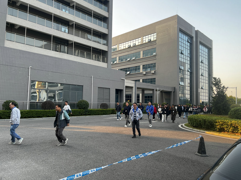 現場模擬園區4號樓2樓發生火災,響起消防警報,我司義務消防員前往處置,因火勢過大,請求松山湖消防大隊支援。在我司義務消防員的指引下,全體職工按照既定的逃生路線,迅速有序地往大樓前的空曠地帶撤離集合,全體職工緊張有序、彎腰前行,整個過程無踩踏擁擠、摔傷等現象,疏散過程有序嚴謹。