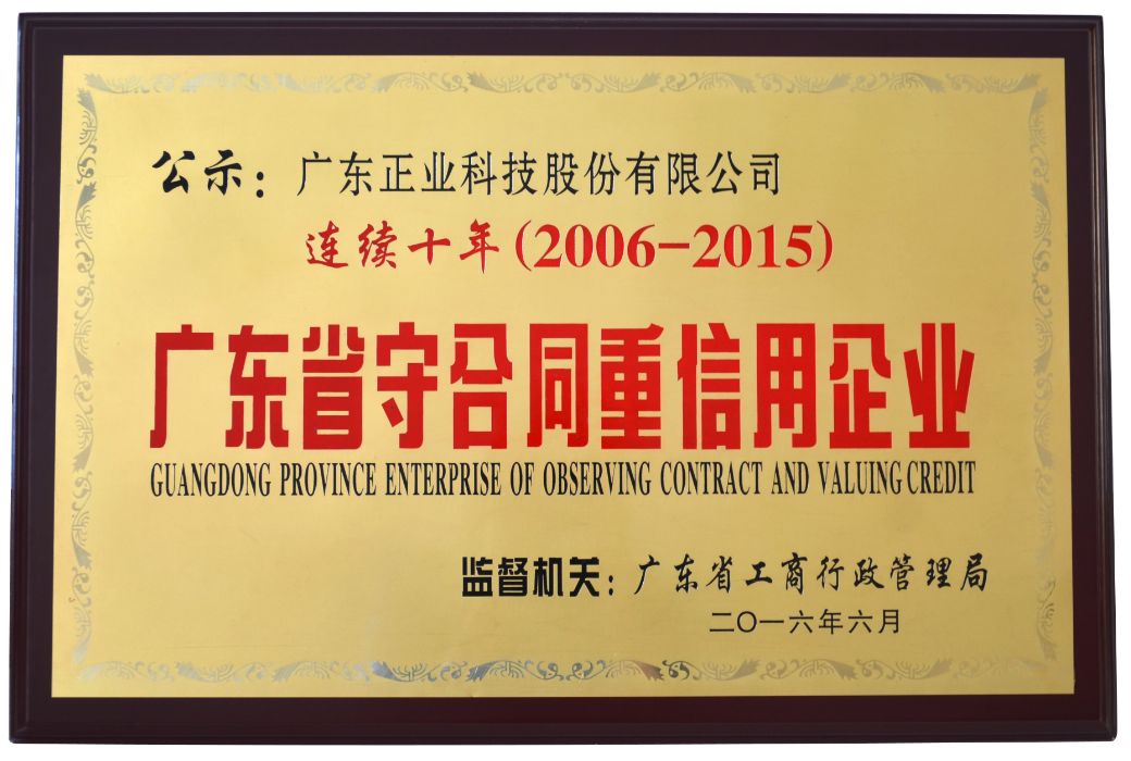 廣東正業科技股份有限公司連續十年(2006-2015)獲得“廣東省守合同重信用企業”榮譽稱號,成為業內值得信賴的良心企業。