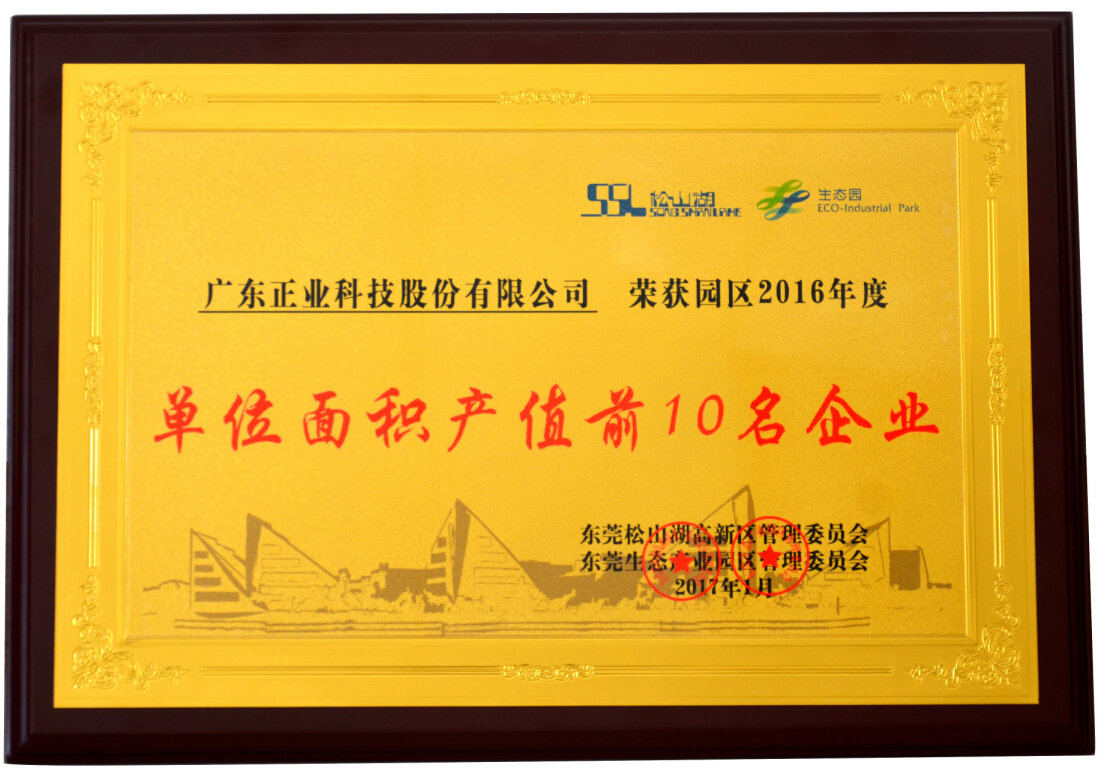 2017年1月,由廣東省東莞市松山湖管委會發布信息,廣東正業科技股份有限公司獲評松山湖(生態園)2016年度先進工作單位,共入選“2016年度園區政企合作關系貢獻獎”(共5家)、“2016年度園區單位面積產值前10名企業”(共10家)和“2016年度園區‘十佳敬業奉獻好人’” 三個評選項目。